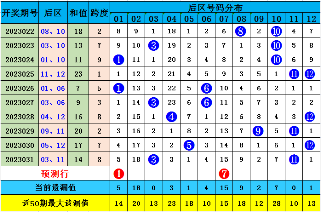 后区第二位上期开出奖号11,较前期点位下降1点,本期注意该位点位下降,参考号码07。后区两码综合推荐:01、07。