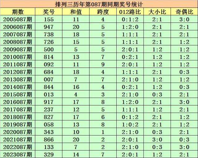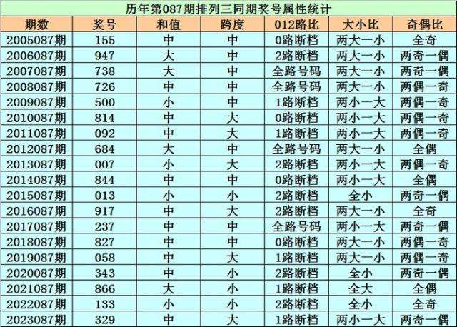 历史上第2024087期排列三已开出19期奖号了,历年同期奖号分别为:155、947、738、726、500、814、092、684、007、844、013、917、237、827、058、343、866、133、329,详细统计见下表: