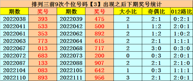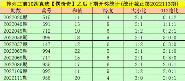 3。在前10次【偶奇奇】类型奖号开出之后,其下期奖号分别开出:555、511、722、099、177、944、777、955、022、966;