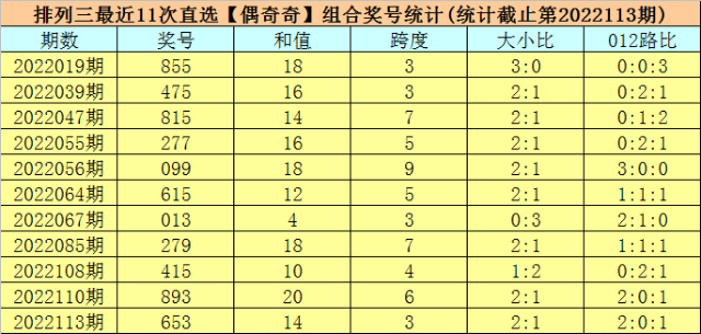 排列三上期奖号为653,开出奇偶类型为【偶奇奇】,前10次【偶奇奇】类型奖号分别开出:855、475、815、277、099、615、013、279、415、893;