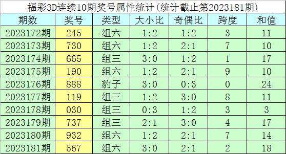 开奖回顾:福彩3D第2023181期奖号为567。奖号形态为组六,大小形态为大大大,奇偶形态为奇偶奇,和值为18,跨度为2。