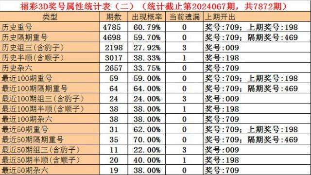 福彩3D第2024065期奖号为469,第2024067期奖号为709,隔期奖号出号9。从统计表中分析,最近100期隔期奖号出现64期,出现比例为64%,最近50期隔期奖号出现35期,出现比例为70%,最近10期隔期奖号出现 8期,出现比例为80%,本期防止试机号中号码轮空。