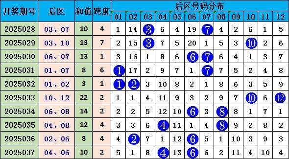 根据近期偶奇走势判断,本期后区推荐:06 09。