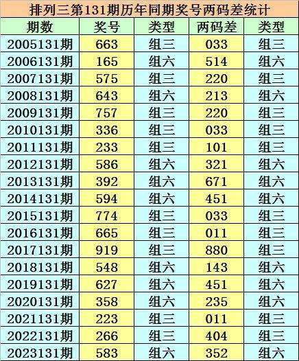 在排列三第131期历史同期开奖中,各号码两码差分别为:033、145、022、123、022、033、011、123、167、145、033、011、088、134、145、235、011、044、235;