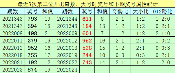 前7次第二位号码开出奇数、大号时奖号分别为:793、594、498、379、952、755、192,其中奇偶总比例为16:5,有1期奇偶比与上期奇偶比相同;号码大小总比例为14:7,有5期奖号大小比与上期大小比相同;