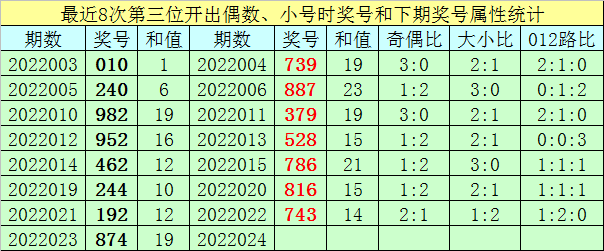 上期回顾:福彩3D第2022023期开出奖号为874,奖号奇偶比为1:2,大小比为2:1,012路比0:2:1。