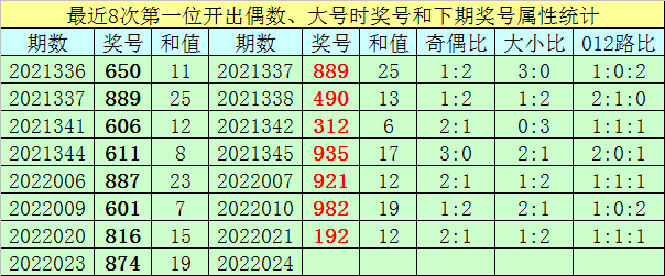 前7次第一位号码开出偶数、大号时奖号分别为:650、889、606、611、887、601、816,其中奇偶总比例为7:14,有5期奇偶比与上期奇偶比相同;号码大小总比例为14:7,有3期奖号大小比与上期大小比相同;