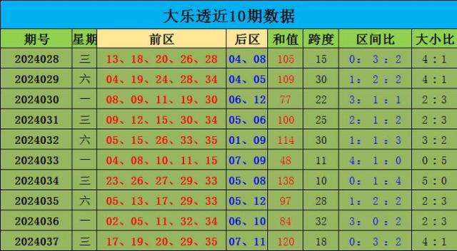 大乐透第24037期奖号为:17 19 20 29 35+07 11,前区三区比为0:3:2,和值为120,大小比为4:1,跨度为18,后区奖号为大大组合07 11。