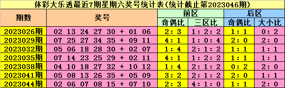 体彩大乐透上周星期六(第2023044期)奖号为02 06 07 08 15 + 07 10,其中前区奖号奇偶比为2:3,三区比为4:1:0,后区奖号奇偶比为1:1,大小比为2:0。