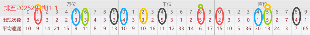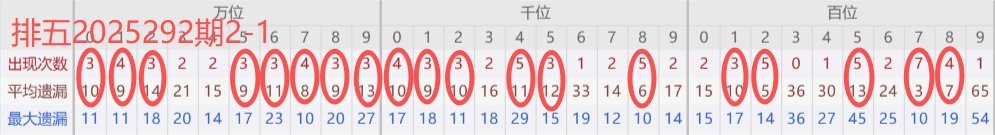 下图所圈出的为近30期各位置所出现的热码出现次数及平均遗漏值,用以参考和一些冷码组合选号。