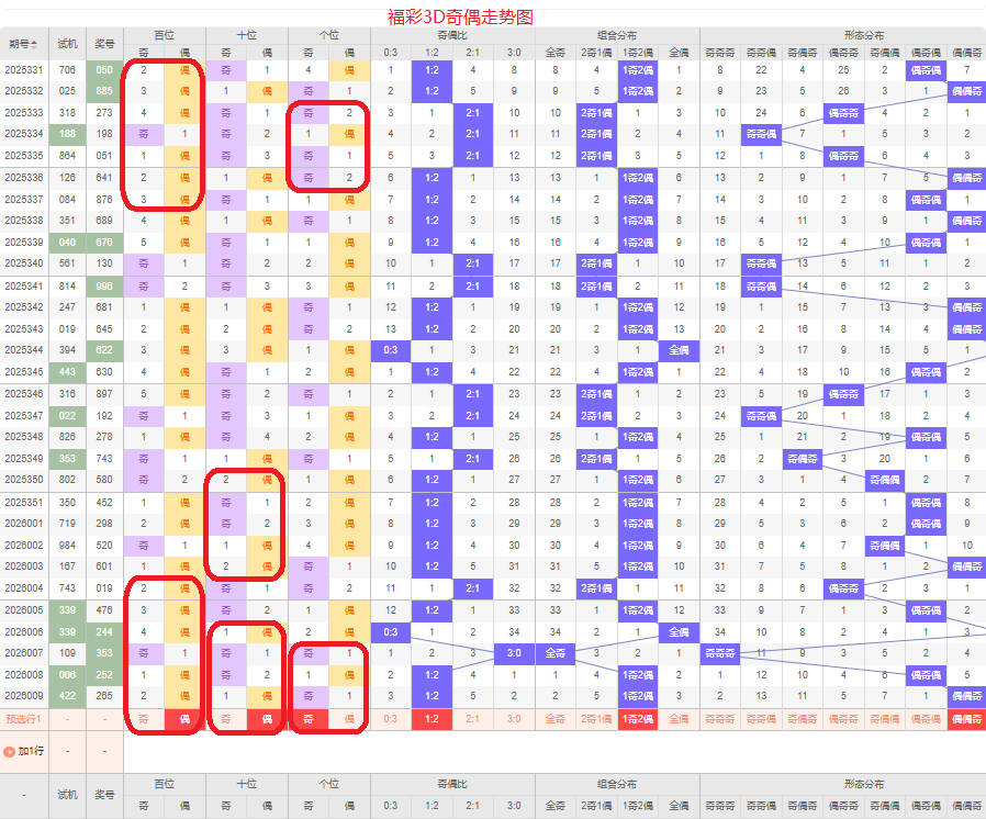 上期奇偶比是1:2,两偶的号码组合方式,从近五期的奇偶数出现情况看,奇数出现6次,偶数出现9次,奇数号码出现较少,本期侧重两偶的号码组合,侧重偶偶奇或奇偶奇的号码组合方式,根据奇偶形态做五码定位02468/02468/13579或13579/02468/13579