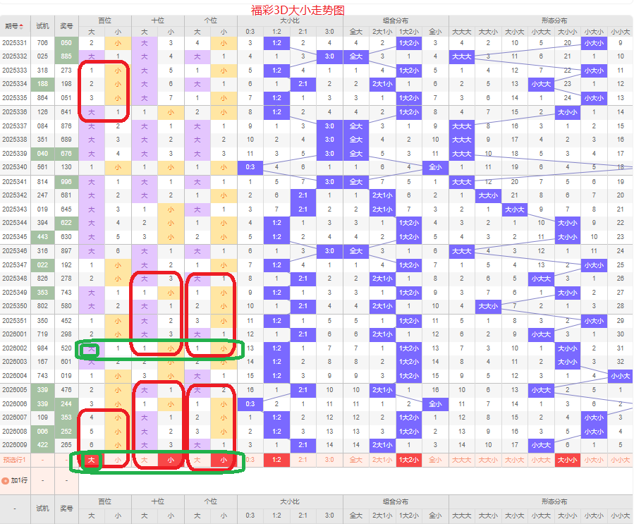 上期大小比为2:1,两大的号码组合方式,从近五期出现情况看,大号码出现6次,小号码出现9次,大号码出现较少,本期侧重两小的号码组合,本期百位侧重大号码,十位侧重小号码,个位要侧重看小,侧重大小小或者大大小的号码组合,根据大小做五码定位56789/01234/01234或56789/56789/01234