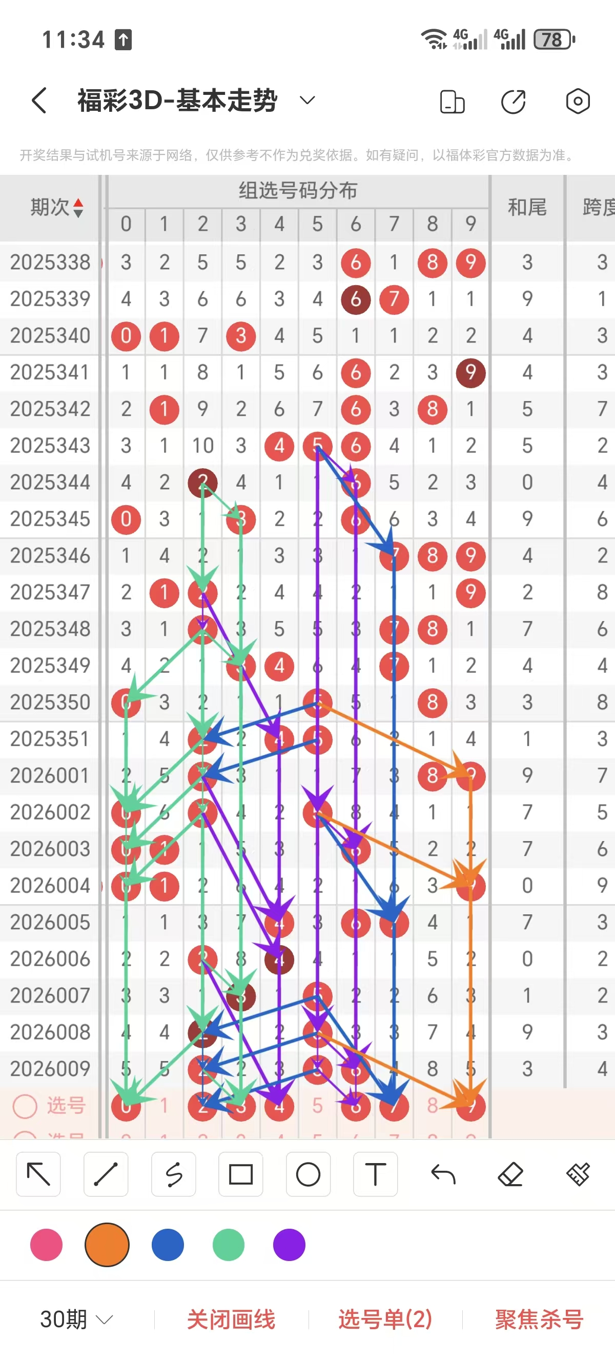 跨度通常情况下在五期之内重复一个跨度的概率很高,近五期重复了2/3的跨度,近五期跨度为3/2/2/3/4,近期02路的跨度较热,上期是1路的跨度,本期要侧重跨度以3/4/9跨为主的号码组合。可以从跨度方面选择相应的双胆码组合,双胆码的选取要根据近期和历史的走势进一步的分析选取。
