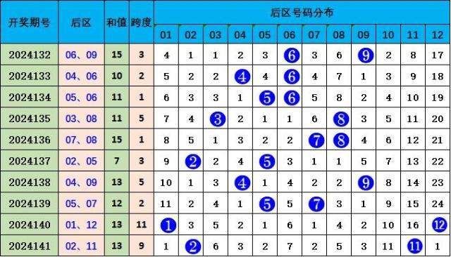 后区综合分析:上期开出后区号码:02 11,跨度9,较上期相比跨度下降2个点位。本期预测跨度值下降,推荐号码:03、07,跨度4。