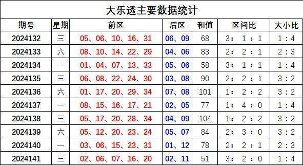 上期回顾:大乐透上期奖号为:前区02 06 07 16 20,后区02、11,前区奖号和值为51,区间比3:2:0,大小比为1:4,