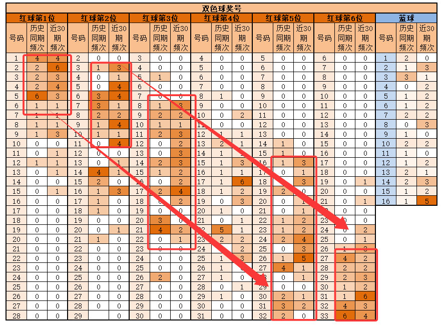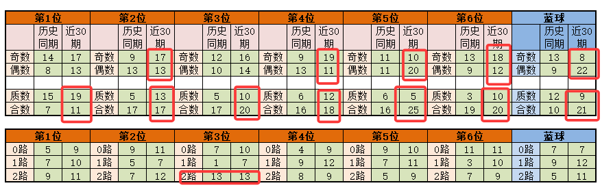 第6位,基本在24-33之间,历史同期频次最多的为27-29-32-33;近30期,频次最多的为31,明显特征是合数奇数优势,012路差别不大;推荐重点29-30-31-32-33。