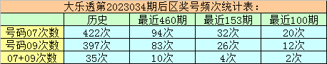 万妙仙大乐透第2023034期前区热号分析:(统计最近460期数据)