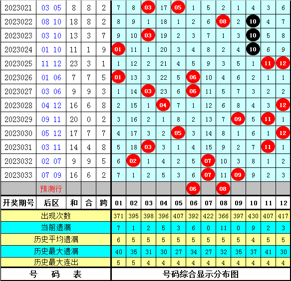 本期后区注意四码03、06、08、10,单挑两码06、08。
