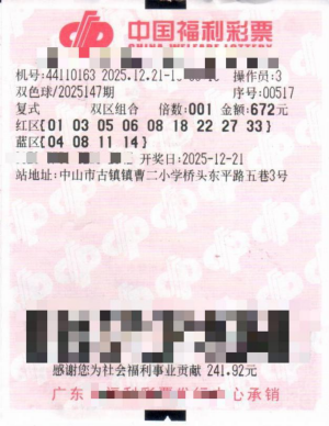 2025年12月21日,中国福利彩票“双色球”第2025147期开奖,当期全国共中出一等奖21注,其中1注花落广东省中山市古镇44110163福彩销售站点。中奖彩票为一张复式“9+4”彩票,共中得一等奖1注,二等奖3注,中奖奖金627多万元。据悉,这是中山市今年中出的第9个500万元以上福彩大奖。