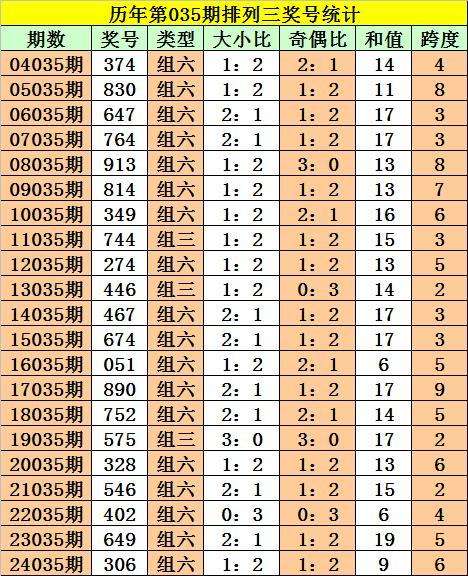 历年第035期排列三奖号:374 - 830 - 647 - 764 - 913 - 814 - 349 - 744 - 274 - 446 - 467 - 674 - 051 - 890 - 752 - 575 - 328 - 546 - 402 - 649 - 306。