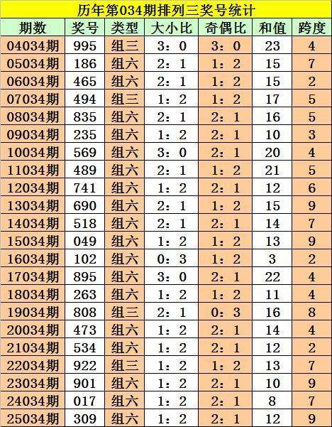 排列三第2025034期奖号:309,和值12,跨度9,大小比1:2,奇偶比2:1。