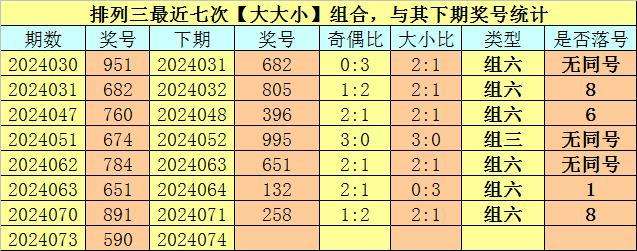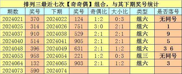 开奖回顾:排列三第2024073期开奖号码为:590。奖号类型为:组六,大小类型为:大大小,奇偶类型为:奇奇偶,无重号。