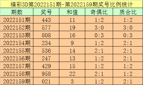 开奖回顾:福彩3D第2022159期:奖号为021,奖号质合比为2:1,大小比为0:3,跨度为2,类型为组六。