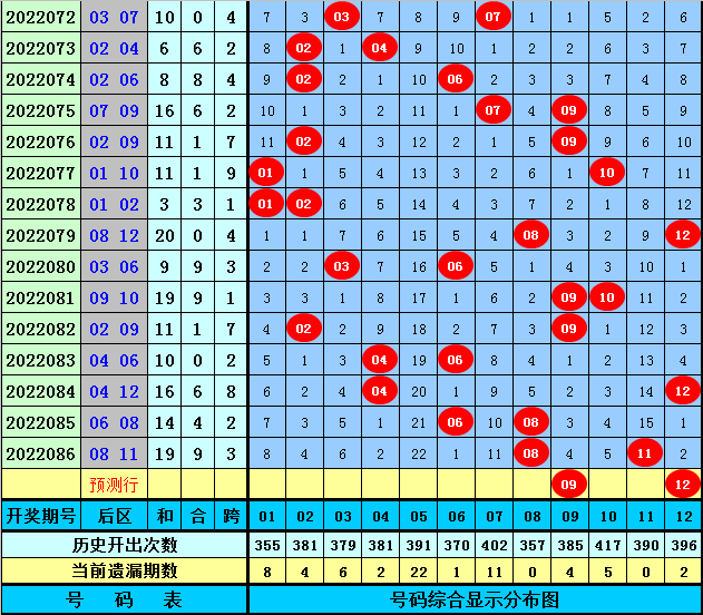 后区分析:后区上期全为2路奖号08和11,最近20期后区奖号012路比为15:11:14,最近两周后区奖号012路比为5:3:4本期后区注意号码02、04、07、09、12,精选全0号码09、12。