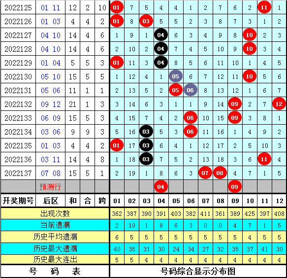 四、后区分析:在138期历史同期开奖中,后区全奇组合出现3次,全偶组合出现3次,一奇一偶组合出现7次;后区全大组合开出4次,全小组合开出3次,一大一小组合开出6次。本期后区两码关注04、09。
