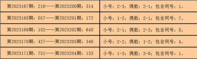 所以,3D第2023172期开出奖号:245,其大小比为1:2,奇偶比为1:2,012路比为0:1:2,与3D第2023205期奖号可能有同号。