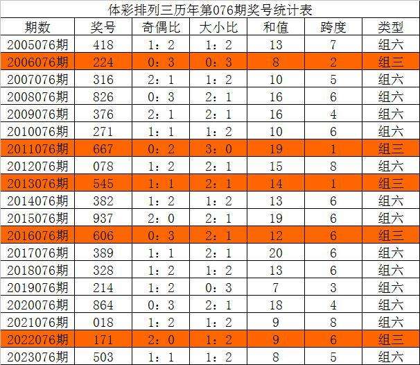 体彩排列三历年第076期开出奖号分别为:418、224、316、826、376、271、667、078、545、382、937、606、389、328、214、864、018、171、503。统计详见下表: