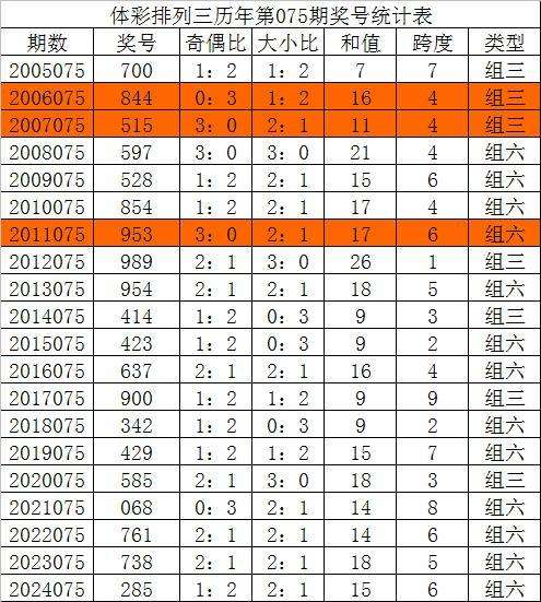 排列三第2024075期奖号为285,奇偶比为1:2,大小比为2:1,和值为15,跨度为6。