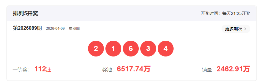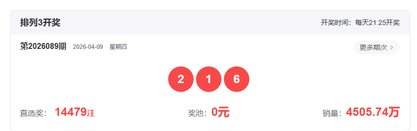 体彩排列3第2026089开奖号码216,形态为组六,奇偶比1:2,和值9,跨度5,大小比1:2,【012】路个数比1:1:1。