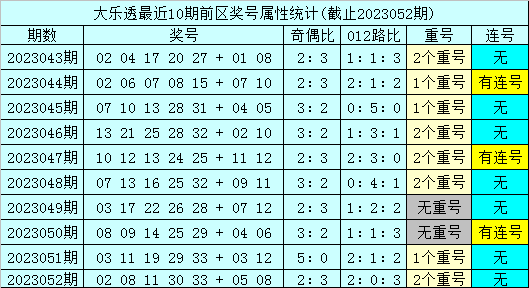 上期回顾:体彩大乐透第2023052期奖号为:02 08 11 30 33 + 05 08,其中前区号码012路比为2:0:3,奇偶比为2:3,包含2个重复号码:11、33。后区号码和值为13,跨度为3。