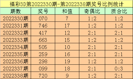 开奖回顾:福彩3D第2022338期:奖号为720,奖号质合比为2:1,大小比为1:2,跨度为7,类型为组六。