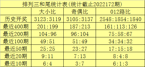 和尾质合推荐:统计前50期奖号,和尾质合比为23:27,合数和尾相对较热;统计前20期奖号,和尾质合比为7:13,质数和尾出现较少,本期看好质数和尾回补。