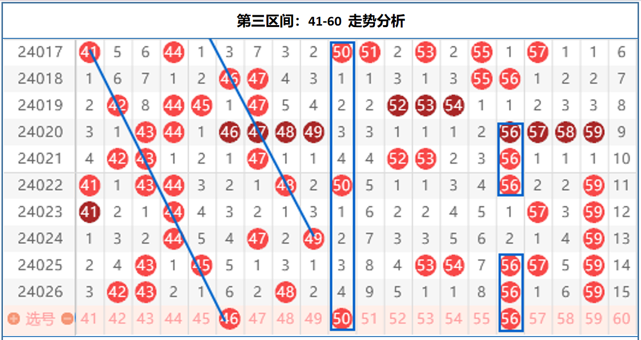 三区分析:【41-60】(走势图标注号码非小黄车大底,请谨慎参考,具体思路将在直播间分享讨论)