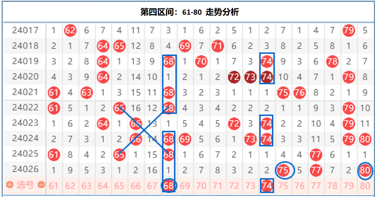 四区分析:【61-80】(走势图标注号码非小黄车大底,请谨慎参考,具体思路将在直播间分享讨论)