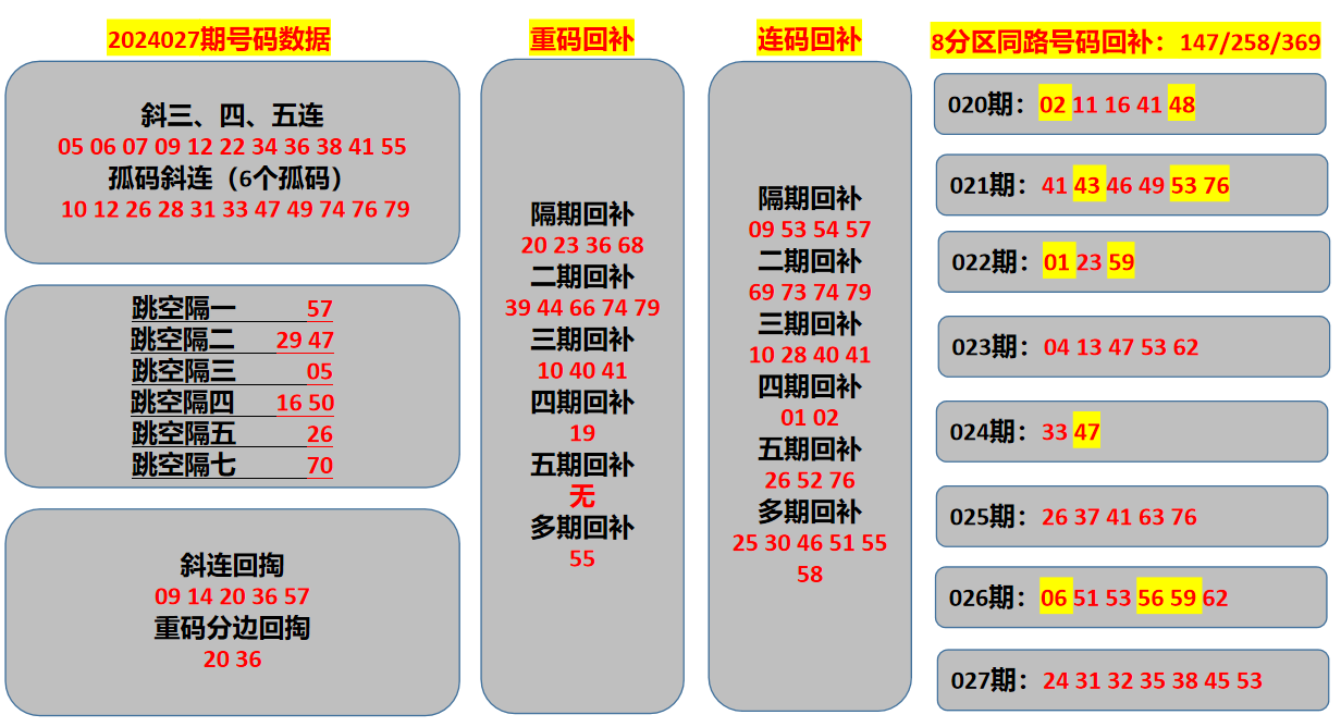 上期二区又一次在空位中开出多码,二区的热度还在,从形态上判断三重码开出两组后的分边和落位是重点,但从其他空位中找回补期也不不太容易的,两次爆区全部都是不带有强势形态的前提出现,这也可能致使这个爆区热度不会持续,而且在后区连续出现1+2+2的开号,即孤码加两组连号的大形态,从布局思路上判断,这里出现1-2码的机会还是有,但也不是重点布局的位置了。所以前区的形态回补又将成为主要布局位置,而目前重码是区间的重点形态,前后区的重码分布上还是可以重点关注一下的。
