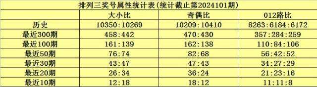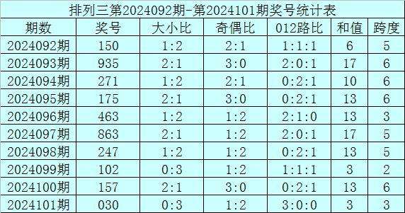 上期回顾:排列三第2024101期奖号为030,奖号012路比为3:0:0,奇偶比为1:2,大小比为0:3,和值为3,跨度为3。
