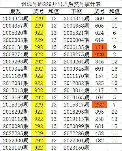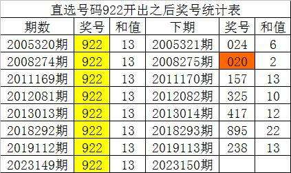 一、上期回顾:福利彩票3D第2023149期开奖结果:奖号为922,奖号和值为:13,奖号跨度为:7。