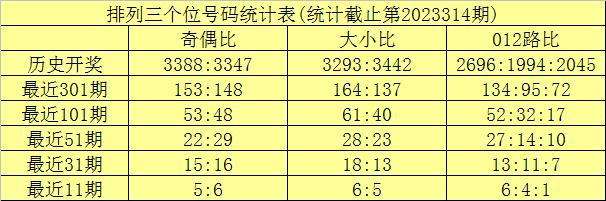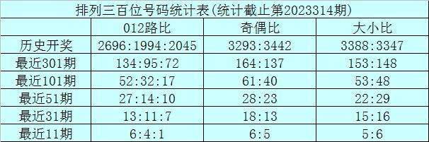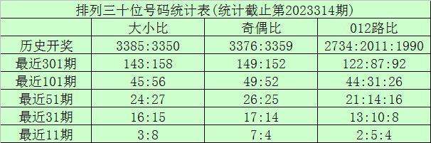 上期回顾:排列三第2023314期奖号为:355。奖号形态组三,大小比2:1,奇偶比3:0,012路1:0:2。