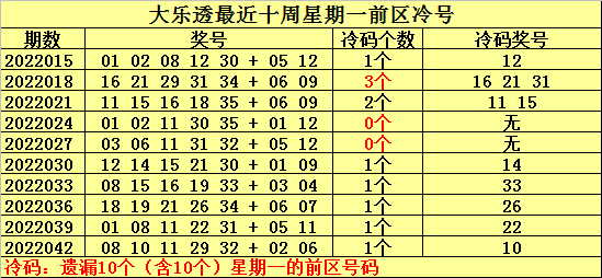 冷号:最近十周星期一前区开出11个冷号,上周星期一冷号出现1个,本周星期一预计冷号强势回归,参考冷号05 27。