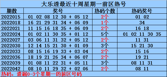 热号:最近十周星期一前区开出24个热号,上周星期一前区开出2个热号,本期预计热号继续火爆,关注号码01 10 26。