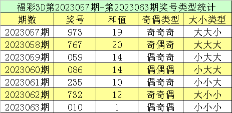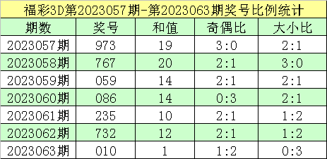 福彩3D第2023063期回顾:奖号为010,奖号奇偶比为1:2,大小比为0:3,和值为1,类型为组三。