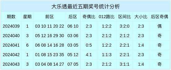 大乐透第2024043期开奖,前区:03、04、08、14、27;后区:07、05。其中前区012路比为2:1:2,后区开出“1路+2路”组合号码。
