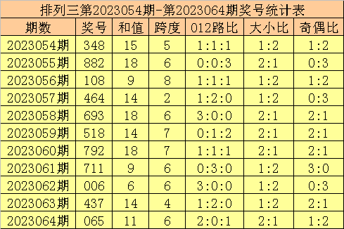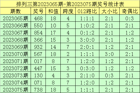 开奖回顾:排列三第2023075期奖号开出:738,组选类型:组六,大小比为2:1,奇偶比为2:1,和值为18,跨度为5。