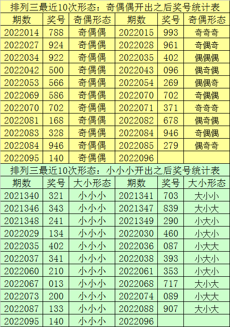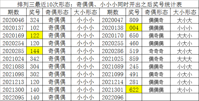 排列三最近10次同时开出奇偶形态:奇偶偶和大小形态:小小小时其奖号分别为:324-102-122-120-144-342-304-302-120-140-140,下期分别开出号码为:809-004-650-460-519-859-245-491-281-622,详细统计见下表: