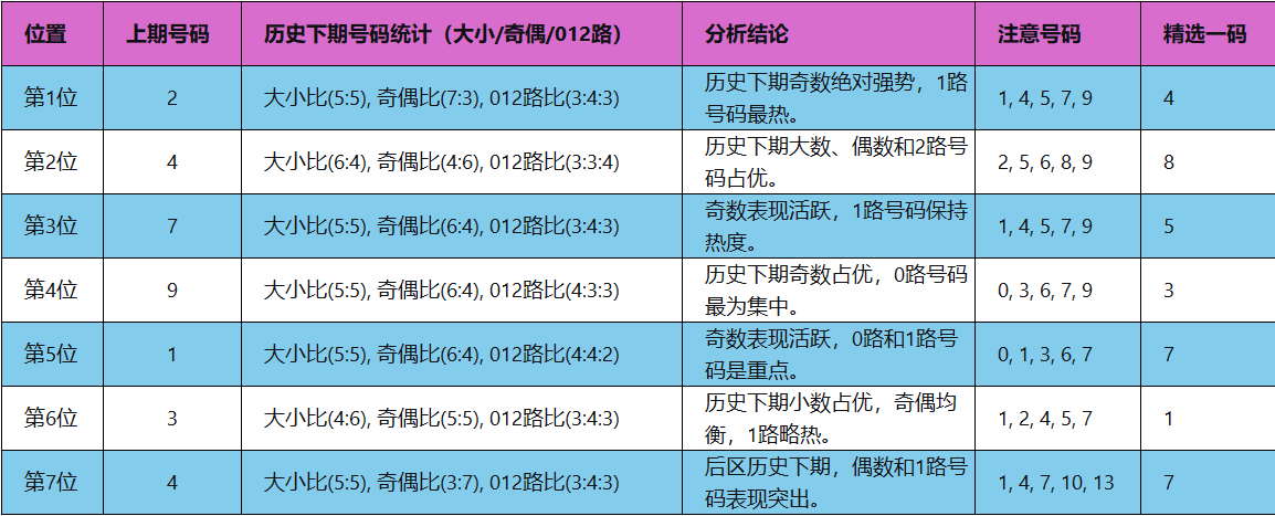 此分析针对第25133期奖号 2、4、7、9、1、3 + 4,查找历史上该位置开出相同号码后,其下期奖号的规律。