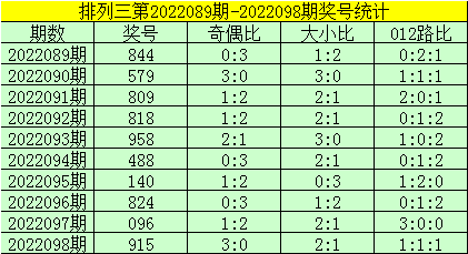 开奖回顾:排列三第2022098期奖号为:915,其奇偶比为3:0,大小比为2:1,奖号012路比为1:1:1。